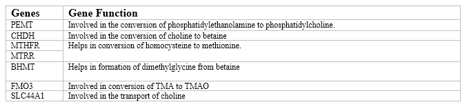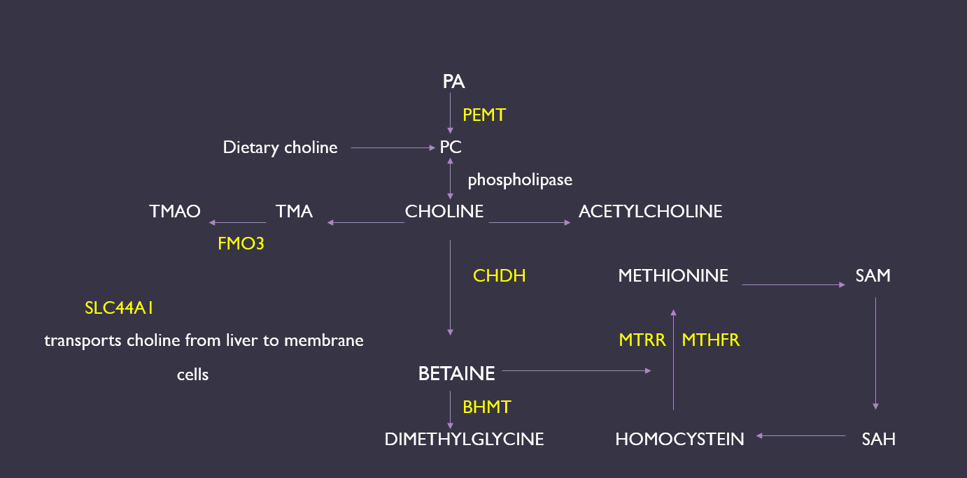 Choline, via its irreversible oxidation to betaine, methylates homocysteine to form methionine with the help of MTRR and MTHFR genes. This is the precursor for synthesis of S-adenosylmethionine, the universal methyl donor needed for methylation of DNA, RNA and proteins. It is important to realize that choline, methionine and folate metabolism is inter-related at the step that homocysteine is methylated to form methionine. (7) And excess of choline levels is converted to Trimethylamine N-oxide is generated from the oxidation of TMA that occurs in the gut microbiota, with the help of FMO3 gene that leads to risk of CVD.